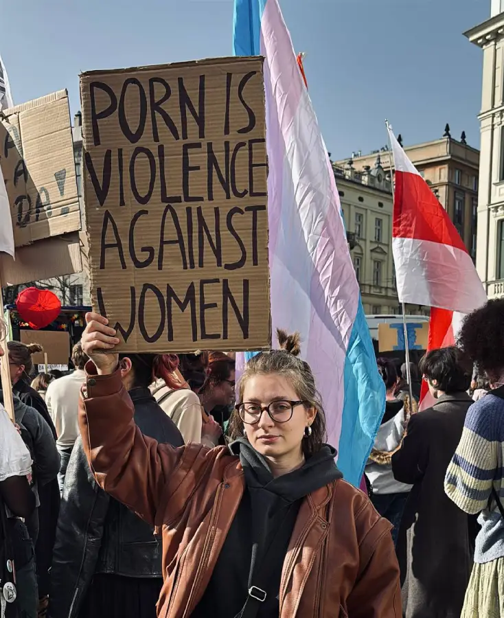 Але, на жаль, тэма парнаграфіі дагэтуль неадназначная нават для фем-супольнасці. У 2026 годзе мяне выгналі з фемінісцкага маршу ў Варшаве з нагоды 8 Сакавіка за плакат Porn is violence against women. Гэта ў чарговы раз паказала, што рыторыка «сэкс-працы» актыўна падтрымліваецца нават у актывісцкіх колах — што вельмі сумна і абсурдна, але тым больш актуальны гэты артыкул.