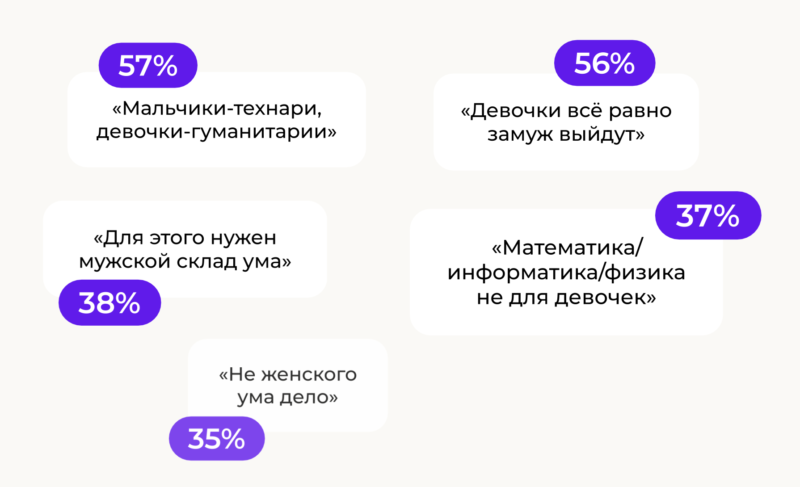 - Общественные стереотипы о женщинах мешают им становиться программистами и инженерами, 95% респонденток сталкивались с предубеждениями о женских способностях. Наиболее распространенные стереотипы, с которыми встречались участницы опроса: «Мальчики-технари, девочки-гуманитарии» (57%), «Девочки всё равно замуж выйдут» (56%), «Для этого нужен мужской склад ума» (38%), «Математика/информатика/физика не для девочек» (37%), «Не женского ума дело» (35%).