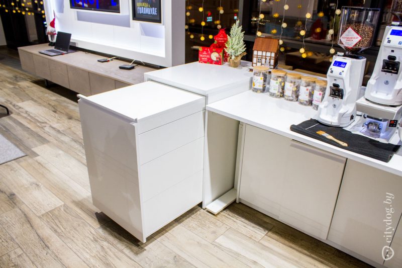 – В кофейню на Романовской спустя несколько месяцев работы пришла обучаться девушка. Она ниже предыдущих работников, и ей неудобно взбивать молоко: она не видит, что происходит. А в новой кофейне столешница регулируется по высоте, тут больше выдвигаемых мест для хранения.