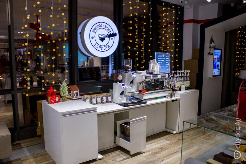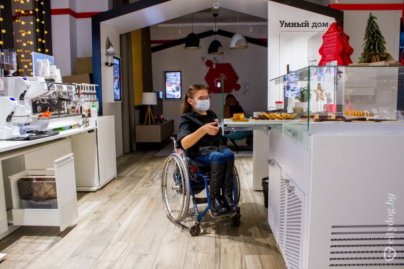 Стойка в первой кофейне – стандартной для колясочников высоты. Для перестраховки при ее создании Татьяна измеряла рост работников. Стойка на Интернациональной регулируется, и это решает много проблем. За ней могут работать и люди с инвалидностью, и люди без инвалидности.